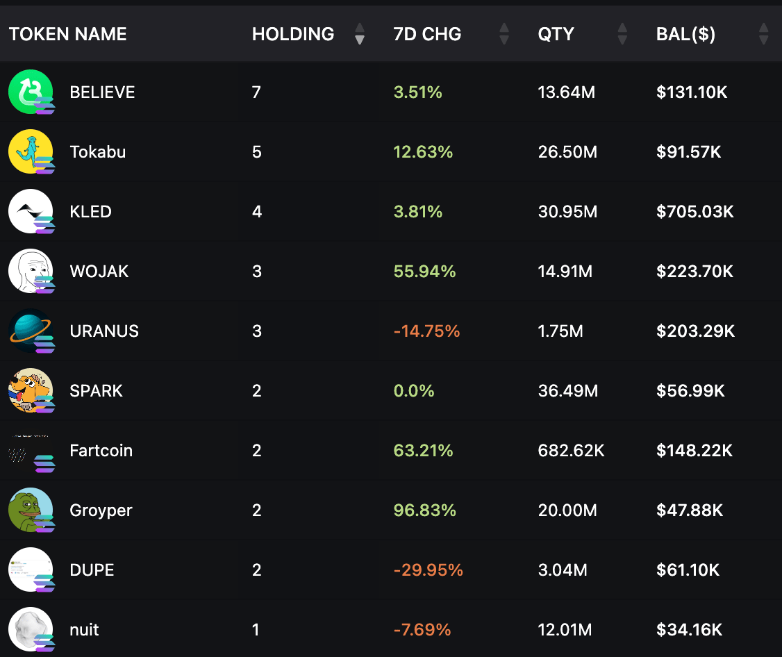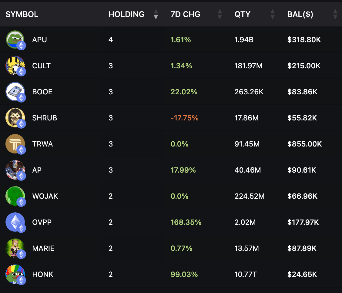 In the EVM meme ecosystem, activity has thinned even further. Last week still had a handful of modest adds across CULT, BOOE, SHRUB and AP, but this week the book is mostly static, with balances drifting lower and wallet behaviour signaling that investors are simply waiting out volatility. Only a few names showed meaningful accumulation. OVPP was the standout, with balances jumping 168% to roughly $177.97K — the strongest impulse buy and one of the only scaled allocations in an otherwise frozen market. HONK posted a 99% lift but still sits at a small $24.65K line, while BOOE, AP, APU, CULT and MARIE saw mild green but nothing that signals conviction.