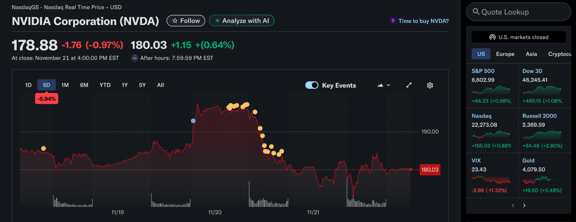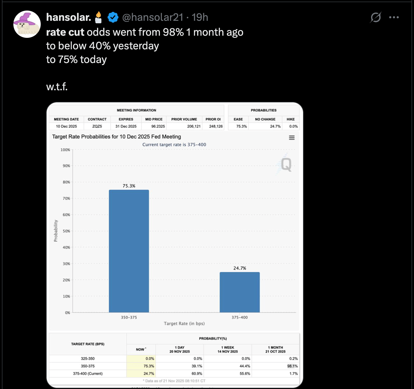 Macro conditions remained chaotic this week as markets absorbed stronger US jobs data, mixed signals from the Fed, and the unwinding of Nvidia’s earnings bounce. Early expectations for a December cut faded after payrolls beat forecasts and Vice Chair Barr reiterated lingering inflation concerns, yet prediction markets abruptly swung toward pricing in more aggressive easing.