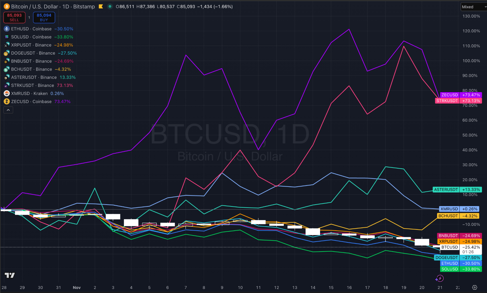 Majors spent the week on the back foot, with almost every large cap extending the drawdown. BTC slid about 10.4%, while ETH underperformed slightly with a 12.6% drop. BNB and SOL weren’t far behind, down roughly 9.7% and 8.6%, and high-beta names like DOGE and ADA absorbed some of the heaviest damage at 12.1% and 18.7%. XRP also retraced sharply, off 14.3%, and TRX held up only marginally better at –6.0%. The profile across the top of the board points to a clear de-risking phase where even the most liquid names struggled to find a bid.