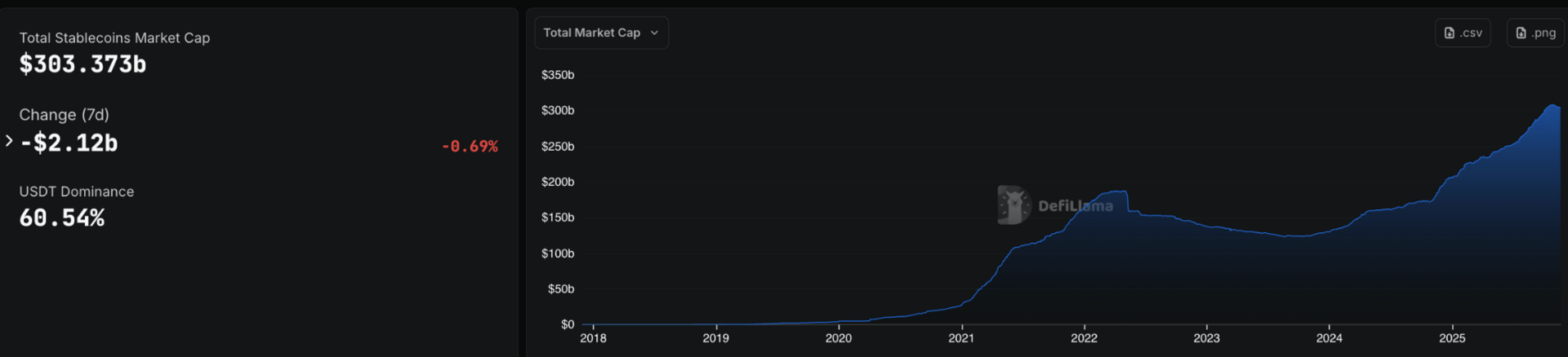 The interesting bit is velocity: volumes are making highs even as total stablecoin cap has softened week-to-week, which implies faster turnover rather than fresh supply. That lines up with a volatile October—more hedging, redemptions/issuance cycles, and DEX/CEX arb moving dollars at speed. For markets, higher stablecoin throughput usually supports liquidity in perps and spot, shortens basis dislocations, and keeps risk transfer efficient even when prices chop. Sustainability from here depends on whether velocity stays elevated or we see renewed supply growth to pair with it.