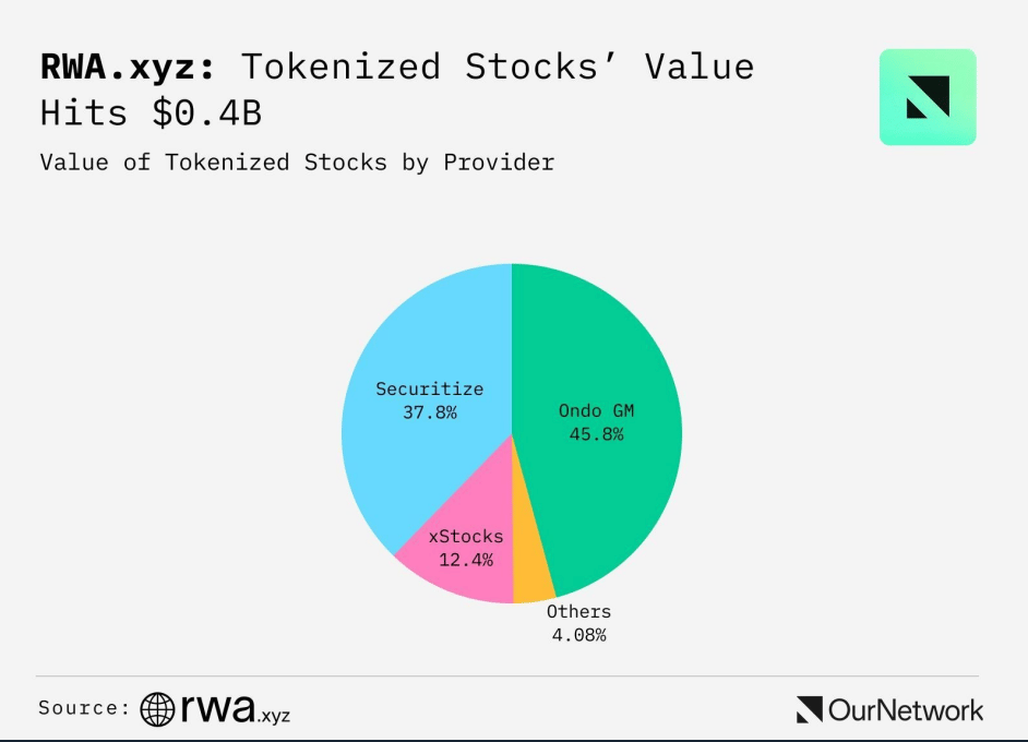 Tokenized equities are starting to look like a real segment, not a side experiment. Q3 value climbed to around $0.4B (+115%), but it’s highly concentrated: Ondo GM controls nearly half the market (~$303M, 45.8%), with Securitize close behind (~$250M, 37.8%) and xStocks a distant third (~$82M, 12.4%).