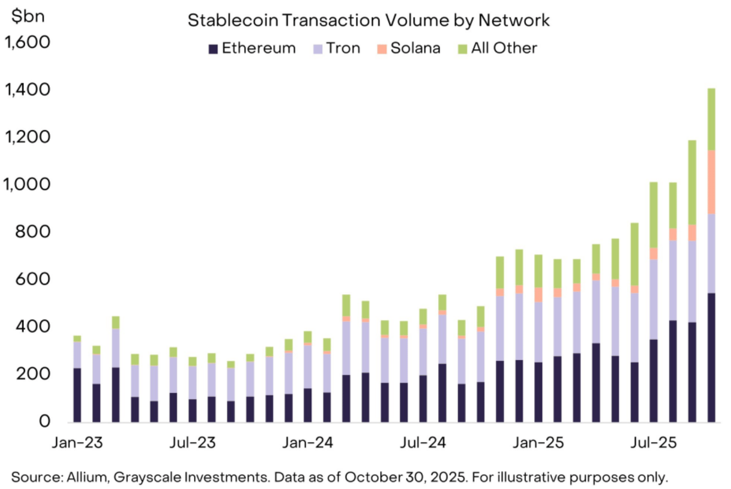 Stablecoin activity just printed a new peak: about $1.4T in on-chain volume for October. Flows remain anchored on Ethereum and Tron (remittances, CEX/OTC settlement), with Solana carving a visibly larger slice and “other” chains climbing as rails diversify.