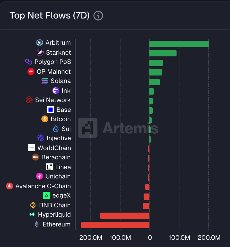 Over the last 7 days, flows rotated toward L2s. Arbitrum led net inflows (≈$200M), with Starknet, Polygon PoS, OP Mainnet, and Solana also positive. On the outflow side, Ethereum posted the largest net withdrawals, followed by Hyperliquid, BNB Chain, edgeX, and Avalanche C-Chain.
