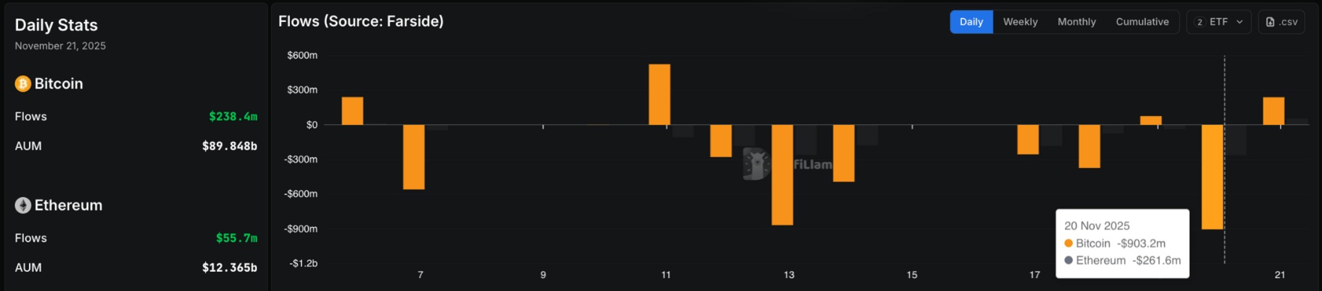 Strategy added $836M BTC despite the turbulence, Saylor reiterated that the firm could withstand an 80–90% drawdown, and El Salvador and Metaplanet disclosed a combined ~$195M of BTC buys. ETH saw modest inflows and fresh attention through new privacy work from Vitalik, alongside his call for quantum-resilience planning.