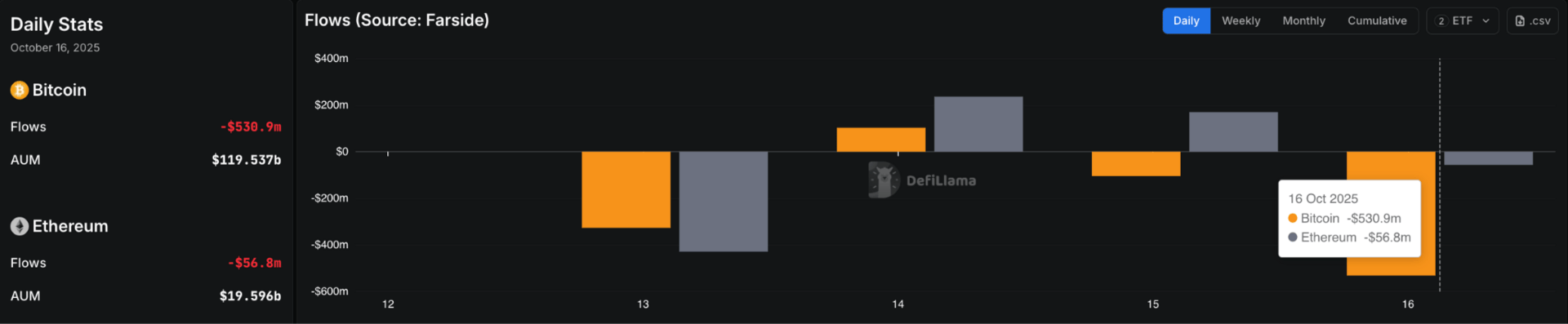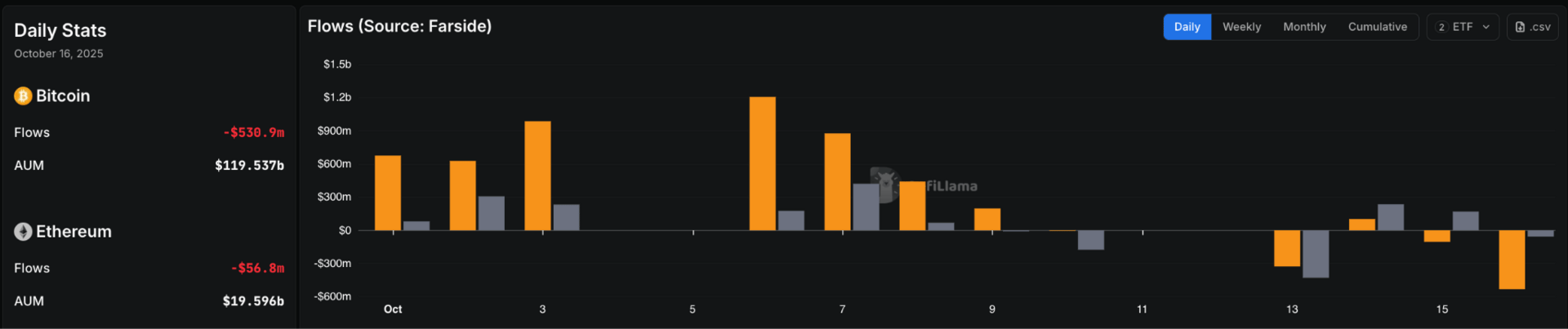 ETF flow trends in October have flipped sharply after what started as a strong month for inflows. During the first week, both BTC and ETH ETFs saw steady demand — daily inflows frequently topped $1B combined as traders repositioned after September’s correction. Momentum looked healthy, with institutional desks rebuilding exposure and market sentiment turning cautiously optimistic.