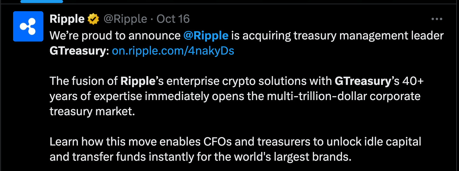 Schwab’s plan to offer crypto trading by mid-2026 highlights how traditional finance continues to deepen its integration with digital assets, even as short-term liquidity remains thin. Further treasury and corporate activity echoed the same trend—Antalpha bought $134M in XAUT, Ripple acquired GTreasury for $1B while leading another $1B XRP fundraise, and Anchorage, Figure, and Sky all advanced new infrastructure and tokenisation initiatives.