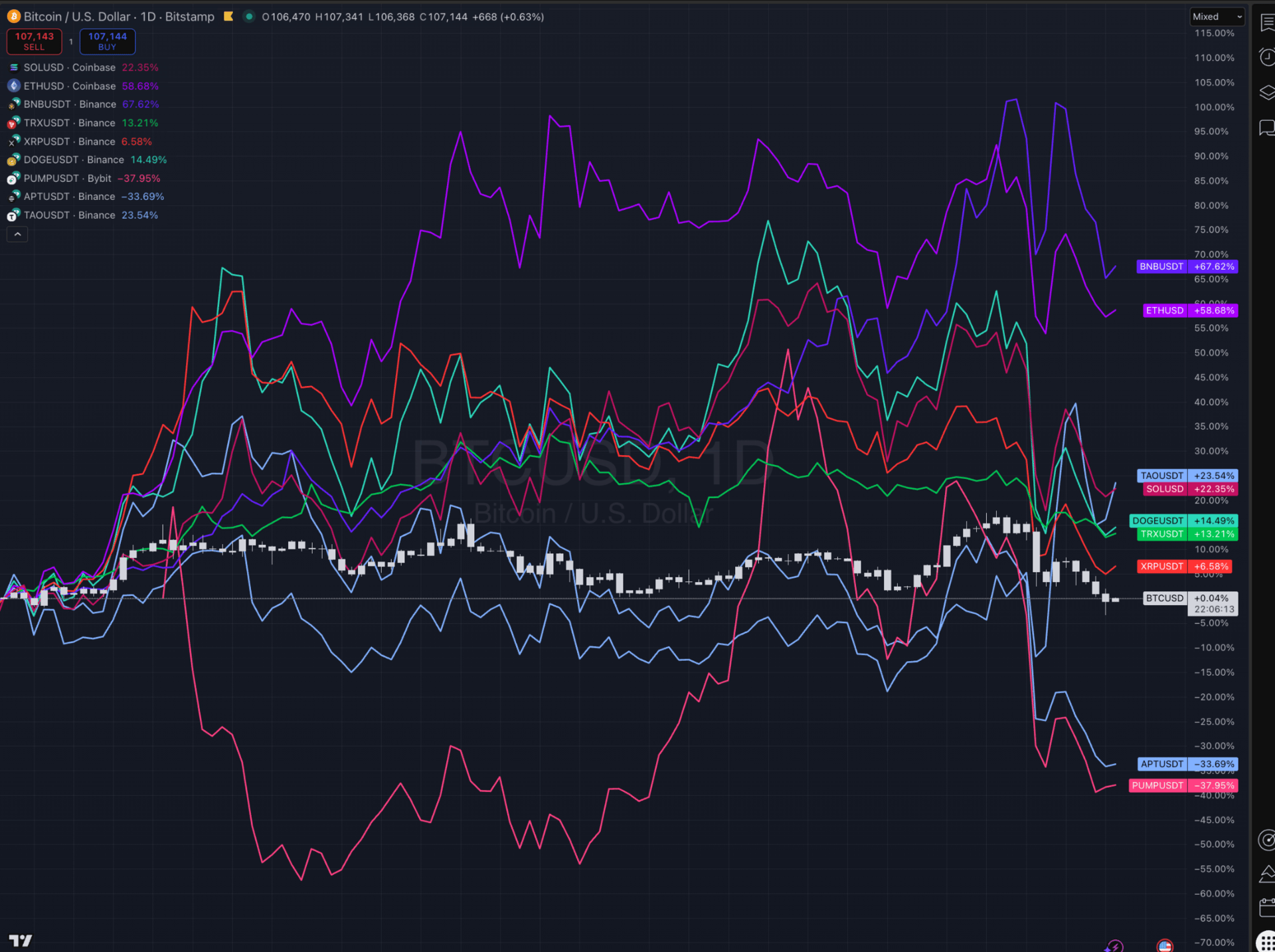 Majors traded heavy this week as the post-liquidation bounce quickly lost steam. BTC led the slide, struggling to find support amid steady ETF outflows and fading momentum. ETH held relatively steady but couldn’t build on early gains, while BNB, SOL, and XRP all rolled over after a brief recovery. ADA, DOGE, and TRX stayed weak, reflecting a broader lack of risk appetite across large caps as traders remained defensive.