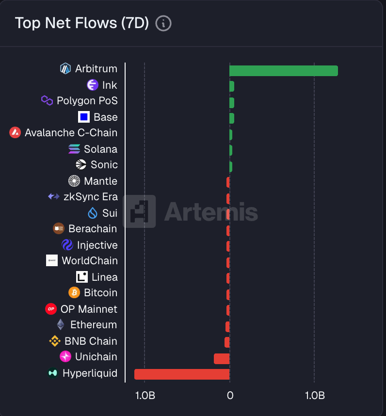 Over the past week, Arbitrum has been the clear outlier in a market otherwise defined by defensive positioning and liquidity withdrawal. Despite the broader downturn and heavy deleveraging across crypto, Arbitrum absorbed nearly $1B in net inflows, signaling that capital is rotating — not retreating entirely — but concentrating in deeper, safer ecosystems. By contrast, Hyperliquid, Unichain, and BNB Chain saw sharp outflows, consistent with traders unwinding risk from smaller or more speculative environments.