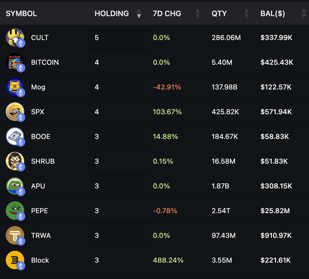 Smart money activity across the EVM ecosystem picked up selectively this week, with wallets showing a mix of strong accumulation in new or smaller names and profit-taking in older positions. SPX led inflows by a wide margin, seeing wallets more than double holdings and pushing balances toward the upper tier of tracked tokens. Block followed with a sharp surge in allocations, jumping nearly fivefold to emerge as one of the most notable new concentrations of capital. BOOE and CULT also attracted light but steady accumulation, maintaining consistent balances across active wallets.