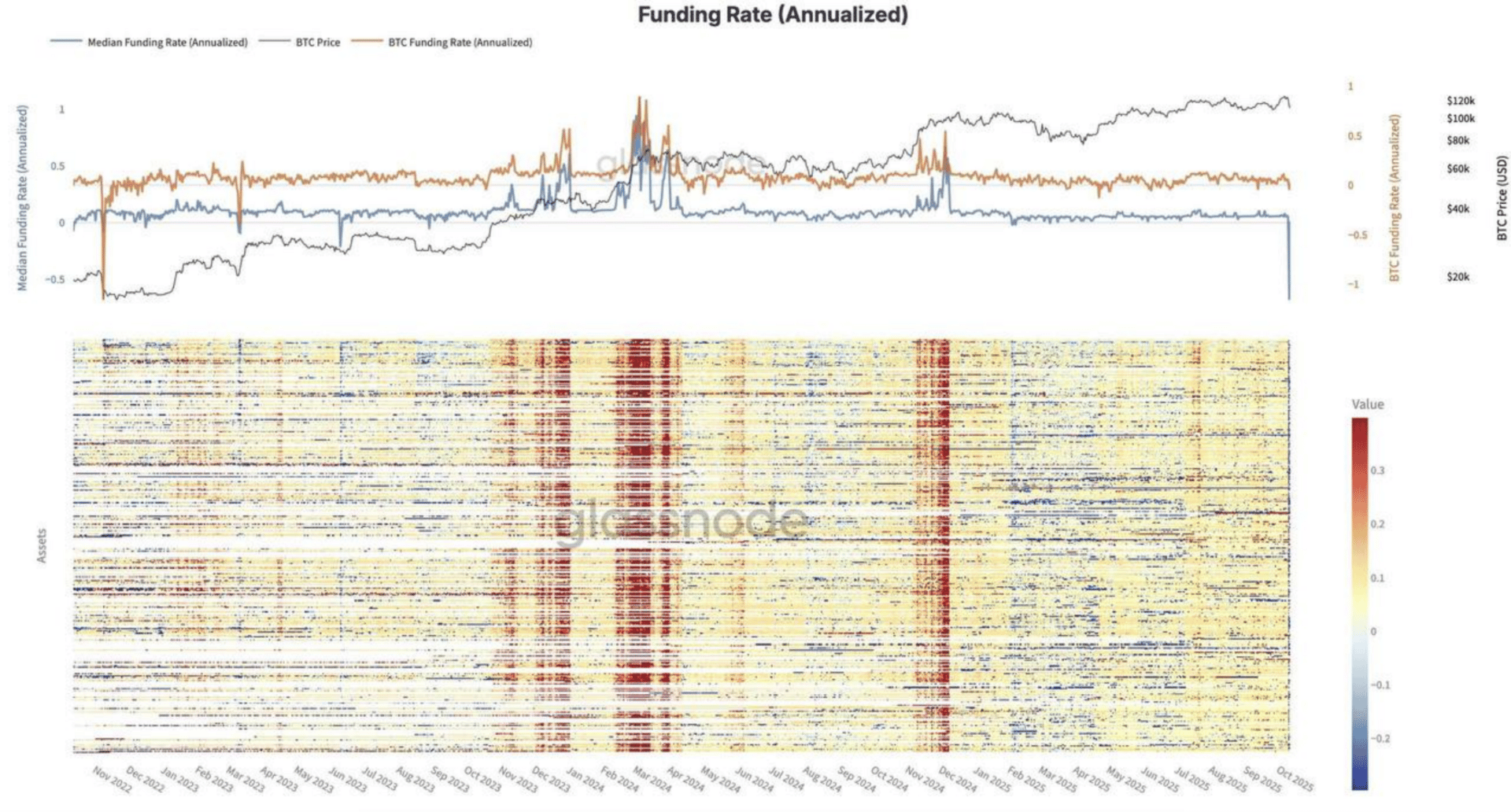 Perpetual funding rates have collapsed across nearly every major crypto asset, plunging to levels not seen since the bear-market capitulation of 2022. What’s unfolding now is a full-scale leverage unwind — traders de-risking, liquidations clearing out crowded longs, and open interest resetting after months of aggressive positioning.