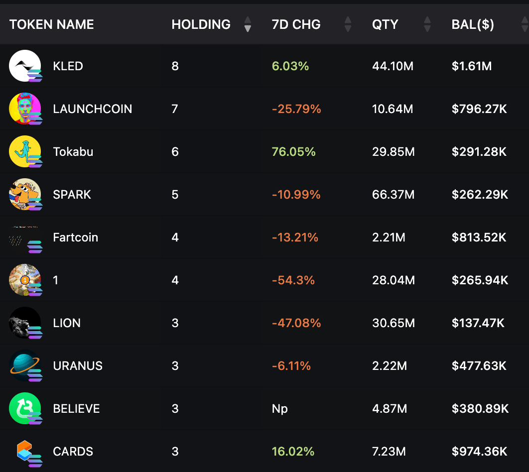 Outflows were broader. The heaviest cuts showed up in 1 and LION, with sizable week-over-week reductions. LAUNCHCOIN and Fartcoin were also pared, alongside smaller trims in SPARK and URANUS—de-risking rather than full exits given their still-meaningful balances.