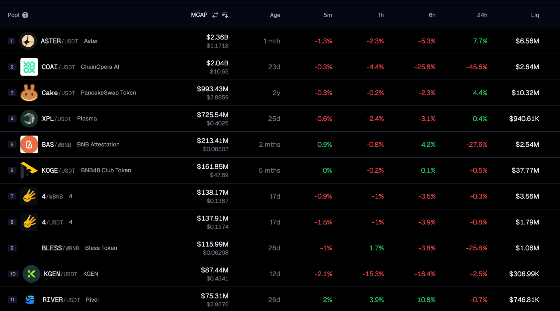 And zoning in on the BNB ecosystem now — activity remains mixed as traders weigh fresh opportunities against lingering caution following recent Binance headlines. Market leaders ASTER and COAI continue to dominate flows, though both saw choppy trading this week. COAI pulled back sharply after a strong multi-week run, while ASTER held firmer and still posted respectable weekly gains. Cake provided some steadiness, with modest inflows helping it remain one of the more stable DeFi plays in the group.