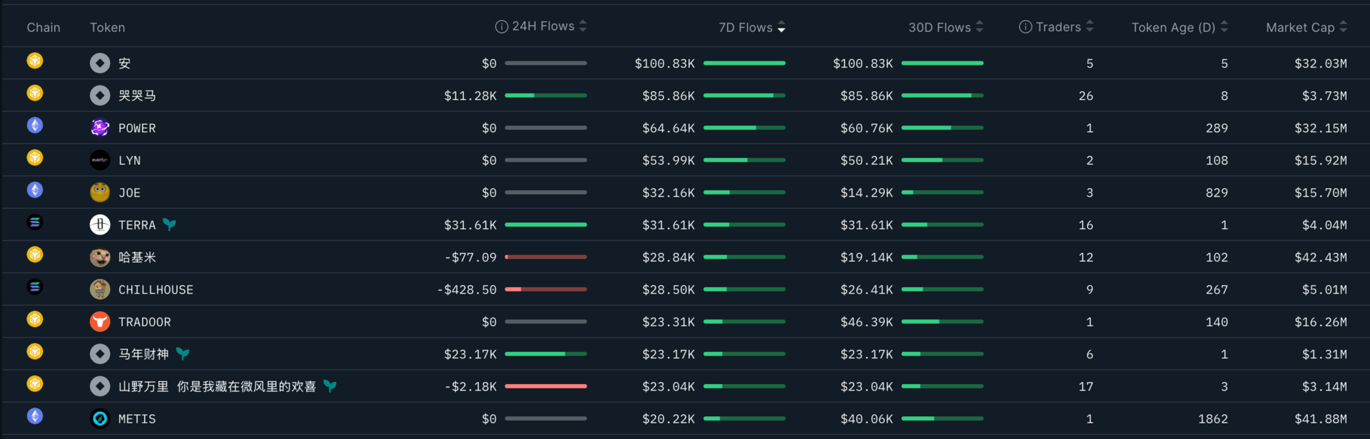 A distinct feature this week is the presence of multiple tokens listed under Chinese-language names, including 安, 哭哭马, 哈基米, 马车财神, and 山野万里 你是我藏在微风里的欢喜. This activity is concentrated on BNB Chain, and the combination of sustained net inflows with a relatively small set of participants points to whale-driven accumulation outside the usual English-speaking venues. It also lines up with what a lot of traders have been observing on the ground: more effort to bridge into non-English communities and liquidity pockets where attention can be earlier and price discovery can be more fragmented. When flows start showing up in these zones, it’s often a signal that risk appetite isn’t gone, it’s just operating off the main stage.