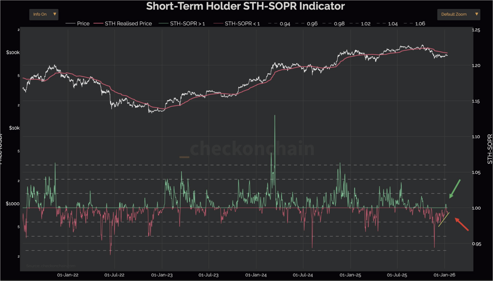 Short-term holder SOPR has slipped back below 1, indicating that recent sellers are realizing losses rather than distributing into strength. This typically reflects late entrants being flushed out as price chops sideways, rather than confident profit-taking. When STH-SOPR sits below 1 during consolidation, it usually points to ongoing base-building, with weaker hands exiting and supply gradually transferring to more patient holders. In that context, the data continues to support the view that the market is working through positioning rather than transitioning into a fully extended phase.