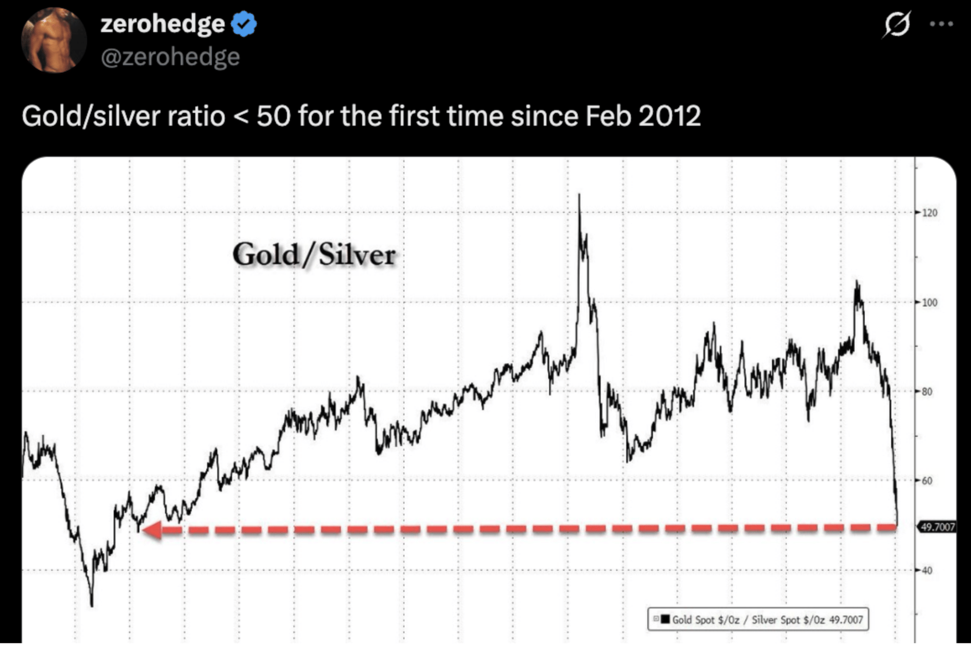 The gold-to-silver ratio has fallen below 50 for the first time since 2012, marking a meaningful shift in relative performance between the two metals. Historically, sustained compression in this ratio reflects rising risk appetite within hard assets, with silver outperforming as capital rotates toward higher-beta exposure.