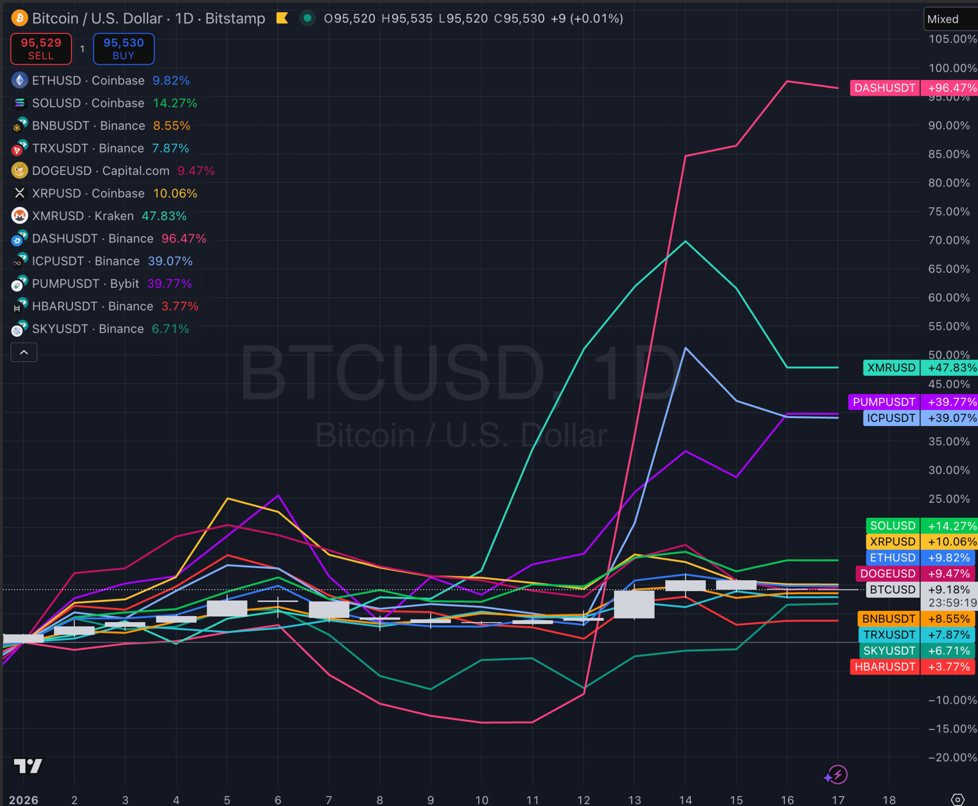 The broader read-through is that, despite a handful of outsized breakouts, overall breadth still looks limited. Strength is showing up in bursts and rotating quickly, while a meaningful portion of liquid names struggle to hold bids. That said, the macro backdrop still appears supportive of a broader breakout attempt if risk appetite stays firm, and the way leadership is holding in BTC, ETH, BNB, and SOL keeps that outcome on the table. Until participation widens beyond a few leaders and the laggards stabilize, the market still reads more like consolidation with selective momentum than a clean, durable trend.