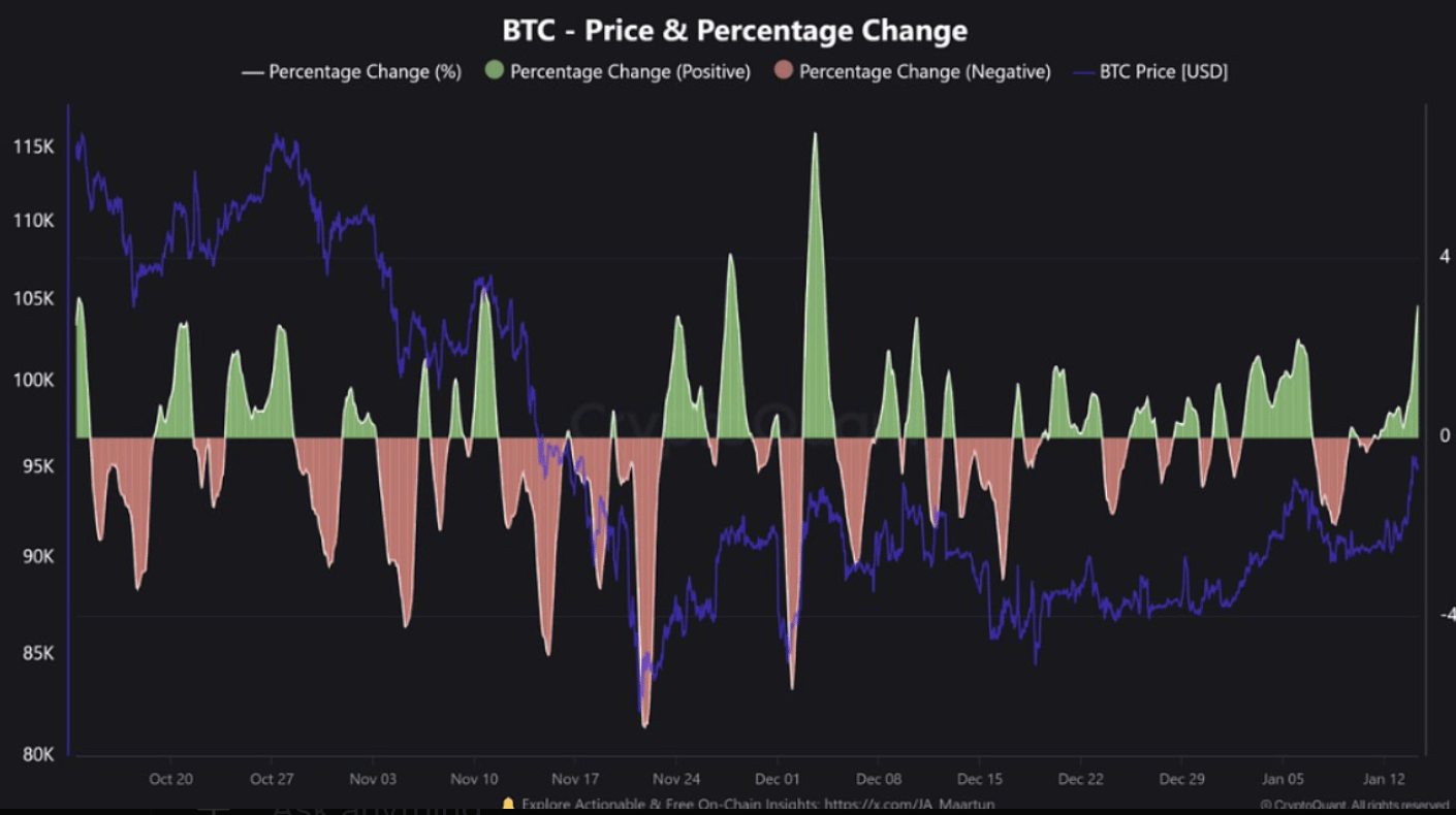 Recent upside in BTC appears to be driven primarily by spot market activity rather than leverage. Positive percentage changes increasingly align with price stabilization and recovery phases, while pullbacks have been shorter and less forceful. That pattern suggests buyers are absorbing supply on spot rather than relying on futures-driven momentum.