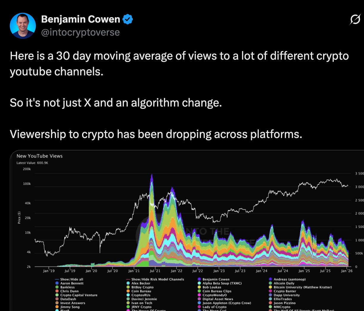 ETH lagged BTC on price but saw a sharp buildup in its staking queue, the highest since 2023, pointing to longer-term positioning even as spot performance lagged. SOL and BNB benefited from a broader pickup in activity, with on-chain usage rising to a nine-month high, while overall trading volumes returned across the market, improving liquidity conditions after a quieter stretch. Retail signals, however, remained subdued, with crypto YouTube viewership falling sharply, reinforcing that this move continues to be driven from the top down rather than by speculative crowd behavior.