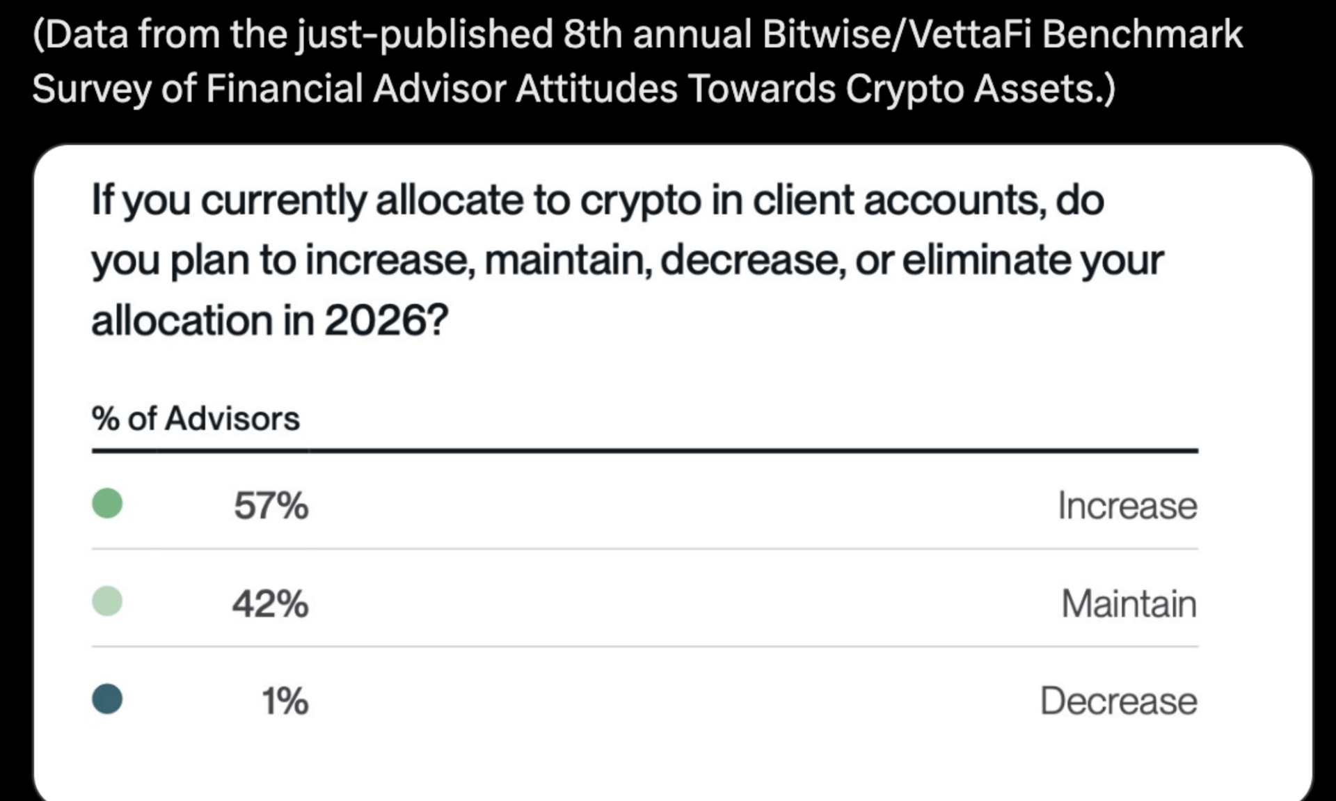 Advisor surveys show overwhelming intent to maintain or increase crypto allocations into 2026, supporting structural demand.