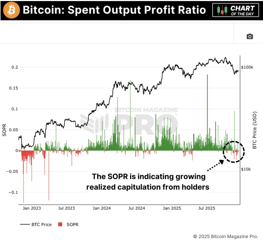 SOPR slipping below 1 confirms coins are being spent at a loss, which fits marginal capitulation and weak-hand cleanup. It does not call a bottom by itself, but it often shows up late in sell pressure within a range, where further downside needs a fresh catalyst.