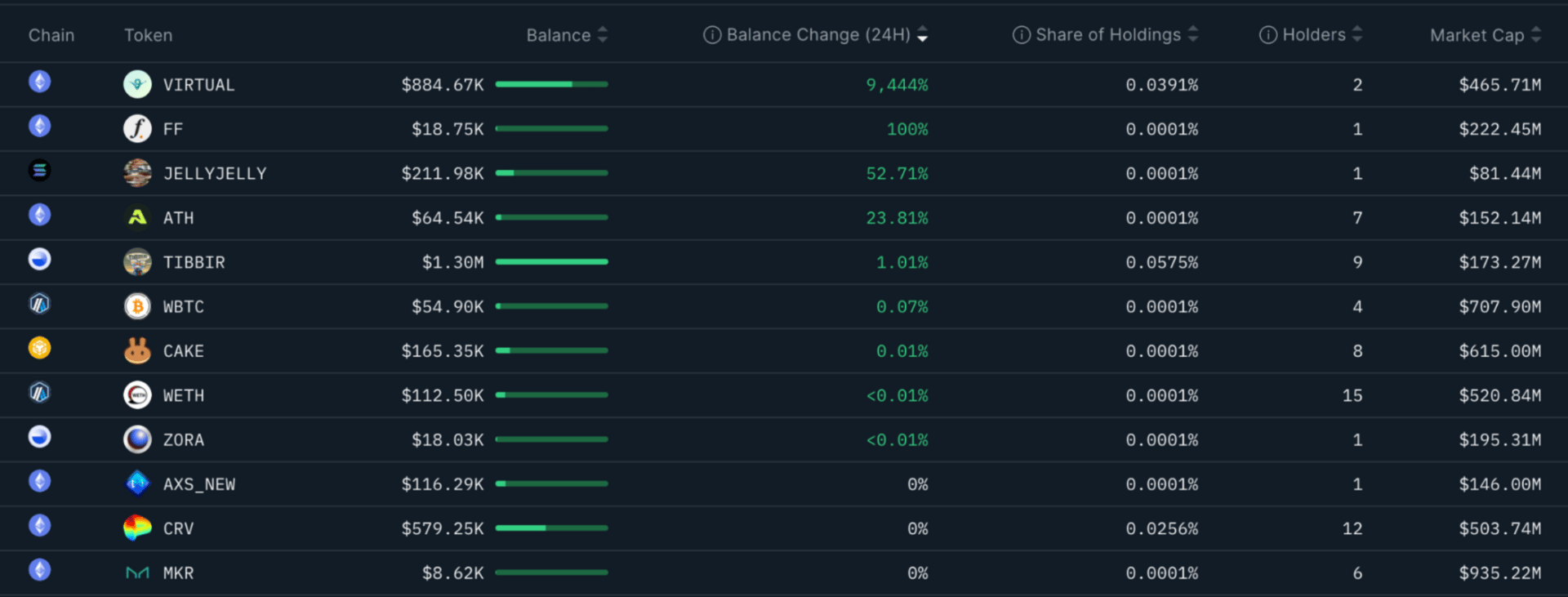 Holdings remain concentrated and mostly stable, reinforcing the idea that smart money is prioritizing structure over turnover. TIBBIR is the standout allocation at roughly $1.3M across multiple wallets, while VIRTUAL shows a sharp balance increase off a small holder base. JELLYJELLY and ATH also show incremental adds, whereas larger names like CRV, MKR, and CAKE look broadly unchanged, suggesting they’re being held rather than actively rotated.