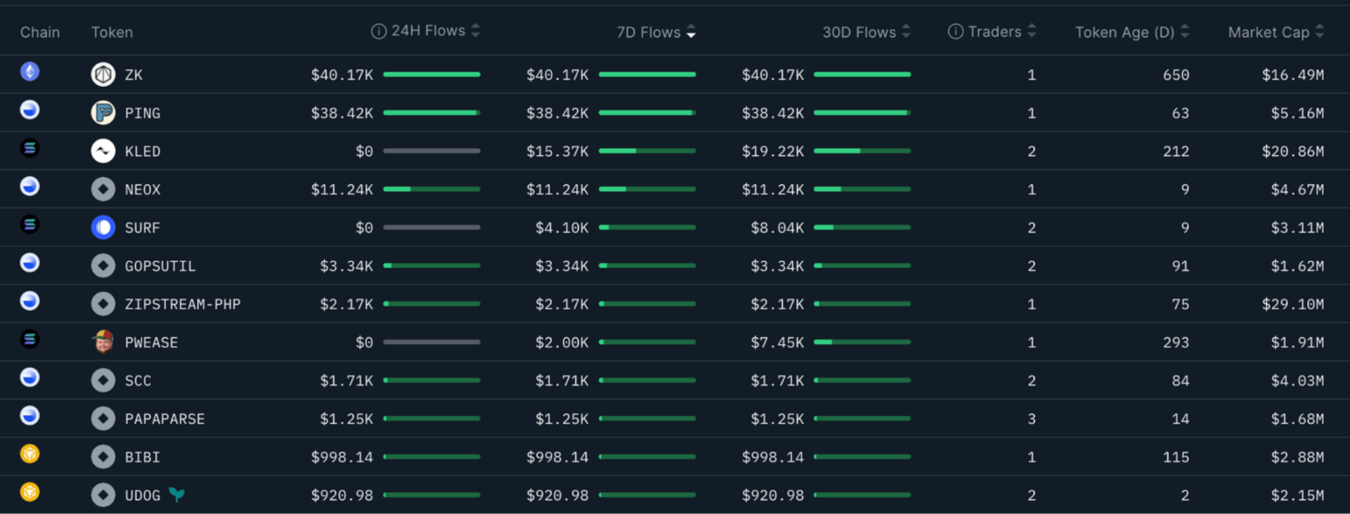 Trench activity is still quiet, but the last seven days show selective smart money engagement rather than a full retreat. Flows are small in absolute terms, yet they clustered into a few names. ZK and PING lead with roughly $40K and $38K in 7-day inflows, both driven by a single wallet, making them targeted bets more than crowd trades. Below that, KLED, NEOX, and SURF also saw steady net buying, but sizing stays cautious, consistent with “probe first, press later” behavior.