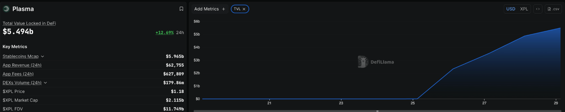 Plasma has erupted onto the DeFi scene, vaulting past $5.4B in TVL within days of launch — a surge that puts it in the same league as established L1s. The chain’s pitch is simple but powerful: gas-free stablecoin transfers, EVM compatibility, and yield-heavy integrations with protocols like Aave and Ethena. Backed by exchange listings and early liquidity campaigns, Plasma has quickly become a magnet for capital.