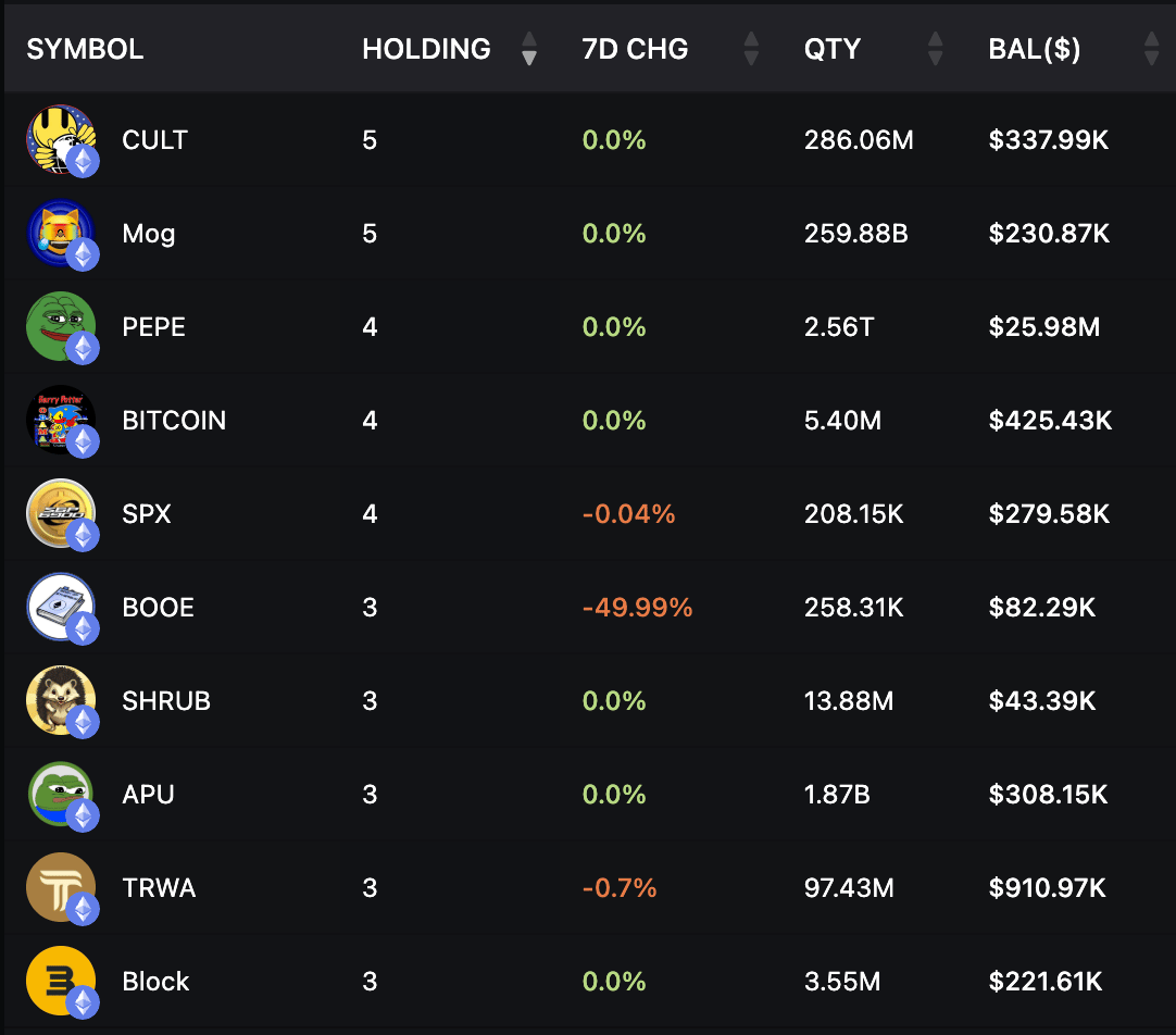 Big allocations like PEPE ( $25.9M), CULT ($338K), Mog ($231K), and BITCOIN ($425K) were unchanged on the week, signaling that wallets are keeping size in long-standing narratives but not adding fresh exposure. Similarly, mid-sized positions such as APU ($308K), Block ($222K), and SHRUB ($43K) held steady.