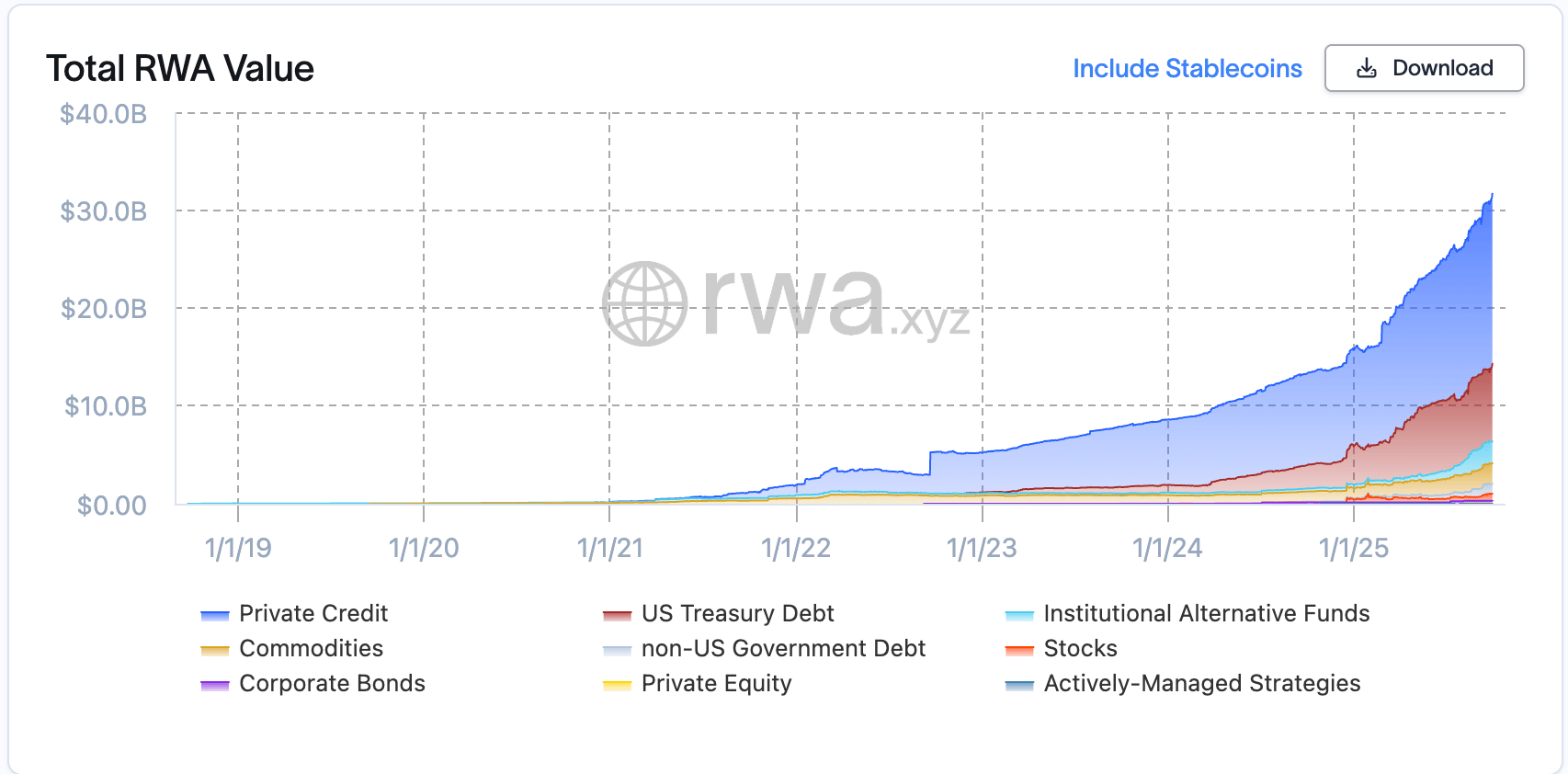 RWAs have exploded to $31.7B in value as of September 30, 2025, highlighting one of the fastest-growing narratives in crypto. Private credit dominates the mix at $17.4B, followed by $7.9B in U.S. Treasuries and over $2B each in institutional alternative funds and commodities. The rapid acceleration since early 2025 reflects both institutional adoption and the hunt for yield, with crypto rails increasingly being used to access traditional fixed-income and credit markets.