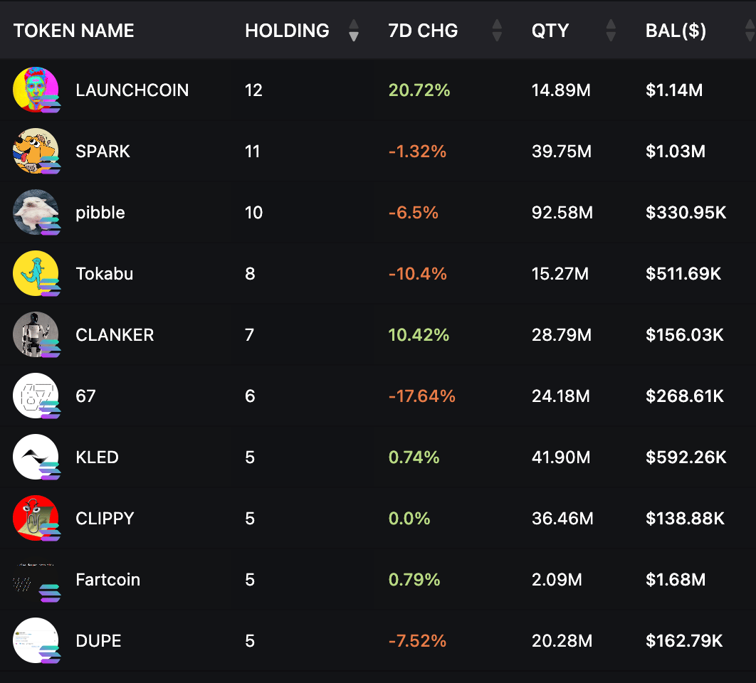 In short: wallets are consolidating into LAUNCHCOIN and a few secondary winners like CLANKER, while steadily paring back older names. This selective accumulation highlights a more cautious smart money stance — risk isn’t gone, it’s just waiting for the next overall market move.