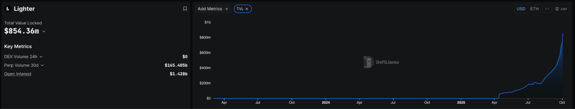 Lighter, a decentralized derivatives exchange, has quickly scaled since opening its Ethereum L2 mainnet to the public. The platform now holds $854M in TVL, with $165B in 30-day perpetuals volume and open interest above $1.4B.