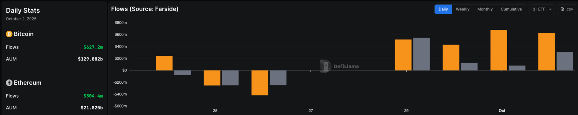 Crypto is back in rally mode. BTC is nearing its ATH, boosted by $2.4B in ETF inflows over the past four days. The latest daily prints show $627M flowing into BTC products and another $304M into ETH ETFs, lifting AUM to $129.9B for BTC and $21.8B for ETH. These strong inflows follow one of the heaviest redemption weeks in months, highlighting how quickly institutional positioning can flip. Even with a government shutdown in play, crypto ETF flows remain very strong, keeping sentiment constructive.