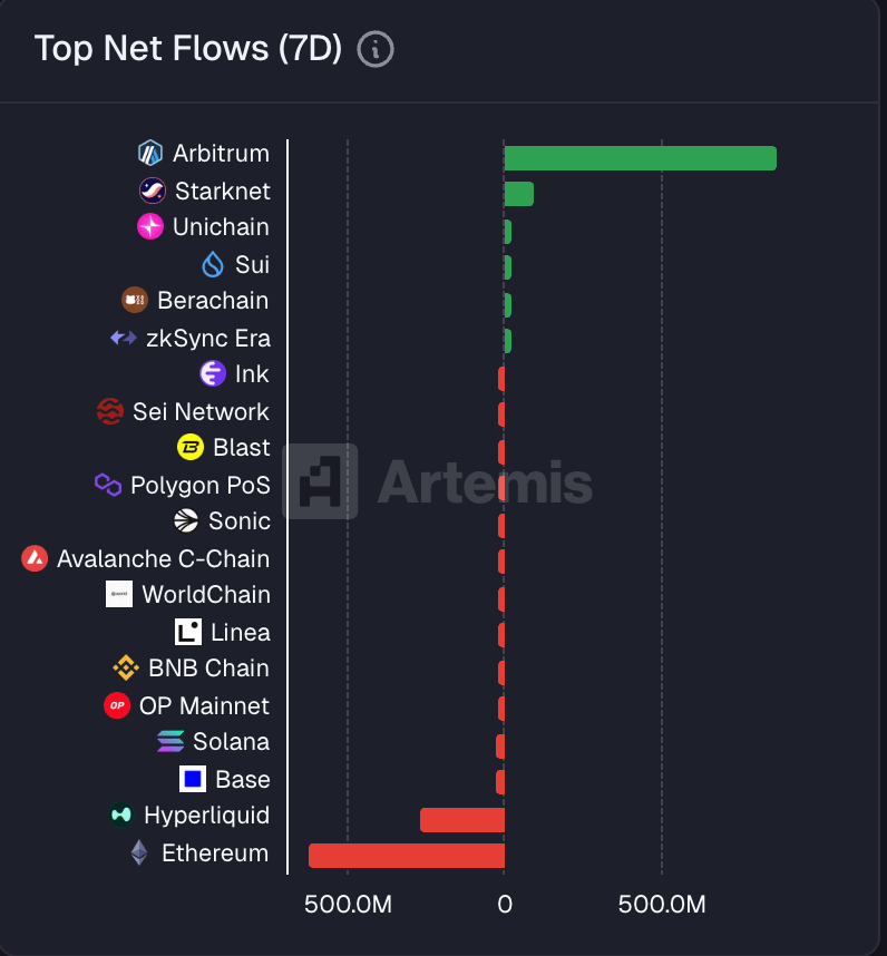 L2 activity over the past week has been led by Arbitrum, which recorded the strongest net inflows among major chains, far outpacing competitors. Smaller positive flows were also observed on Starknet, Unichain, Sui, Berachain, and zkSync Era, pointing to steady capital rotation into newer ecosystems. On the other side, Ethereum registered the deepest outflows, joined by consistent capital exits from Hyperliquid, Base, Solana, Optimism, BNB Chain, and Avalanche.