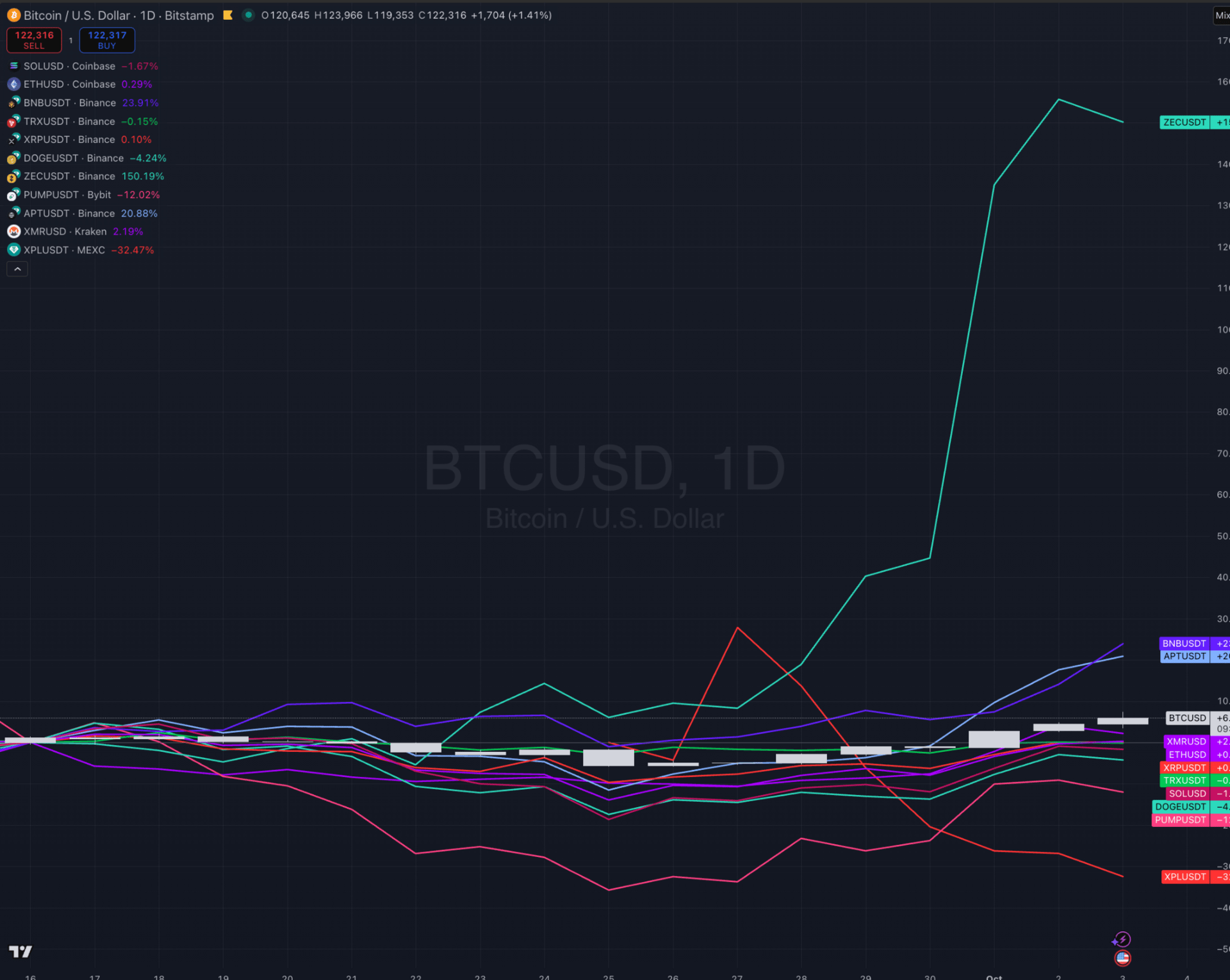 Alts rotated higher, with privacy coins, L1s, and memes among the strongest movers.