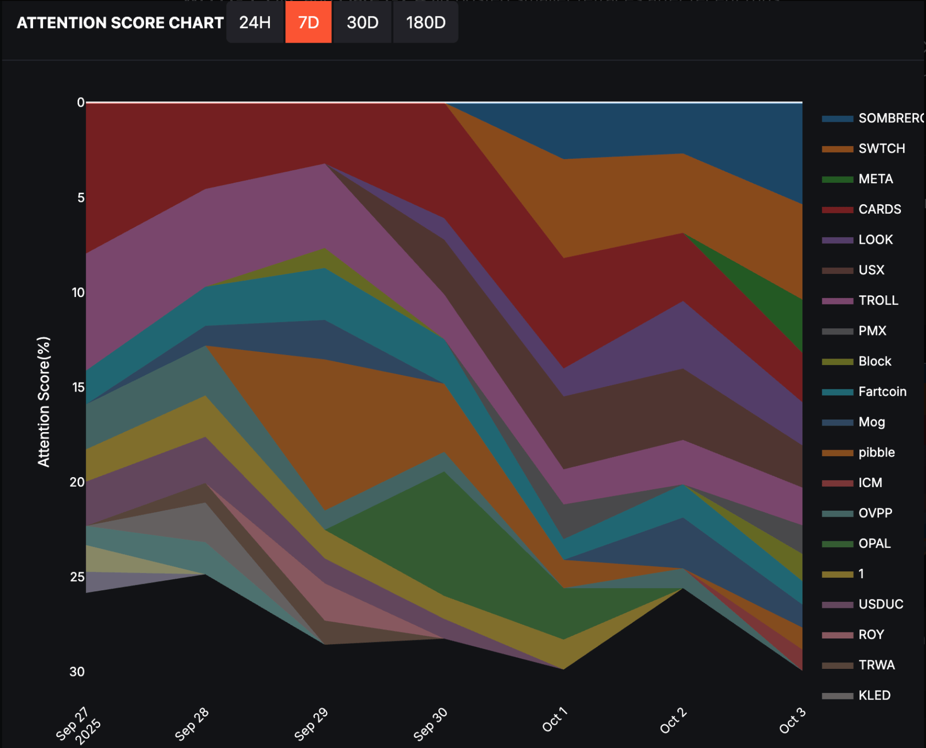 TROLL remained a dominant anchor throughout the period, holding one of the largest and most consistent shares of attention. It’s the meme that continues to attract steady capital regardless of broader rotation, reinforcing its status as a conviction core in smart money positioning. CARDS was another standout, surging mid-week to capture a significant portion of mindshare.